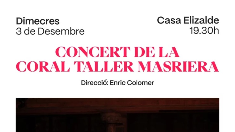 Amb l'ajuda del professor i gran músic Enric Colomer, un grup de veïns i veïnes hem posat en marxa la coral Taller Masriera . Ens reunim quinzenalment per assajar i actuem en diferents ocasions: a la Festa Major, cantem nadales al Mercat abans de Nadal i oferim concerts puntuals. Aquest any, oferirem un petit recital el dimecres 3 de desembre de 2025 a Casa Elizalde , i ens agradaria molt que ens acompanyessis. Si t'agrada cantar, t'animem a unir-te: serà una experiència molt gratificant i divertida!
